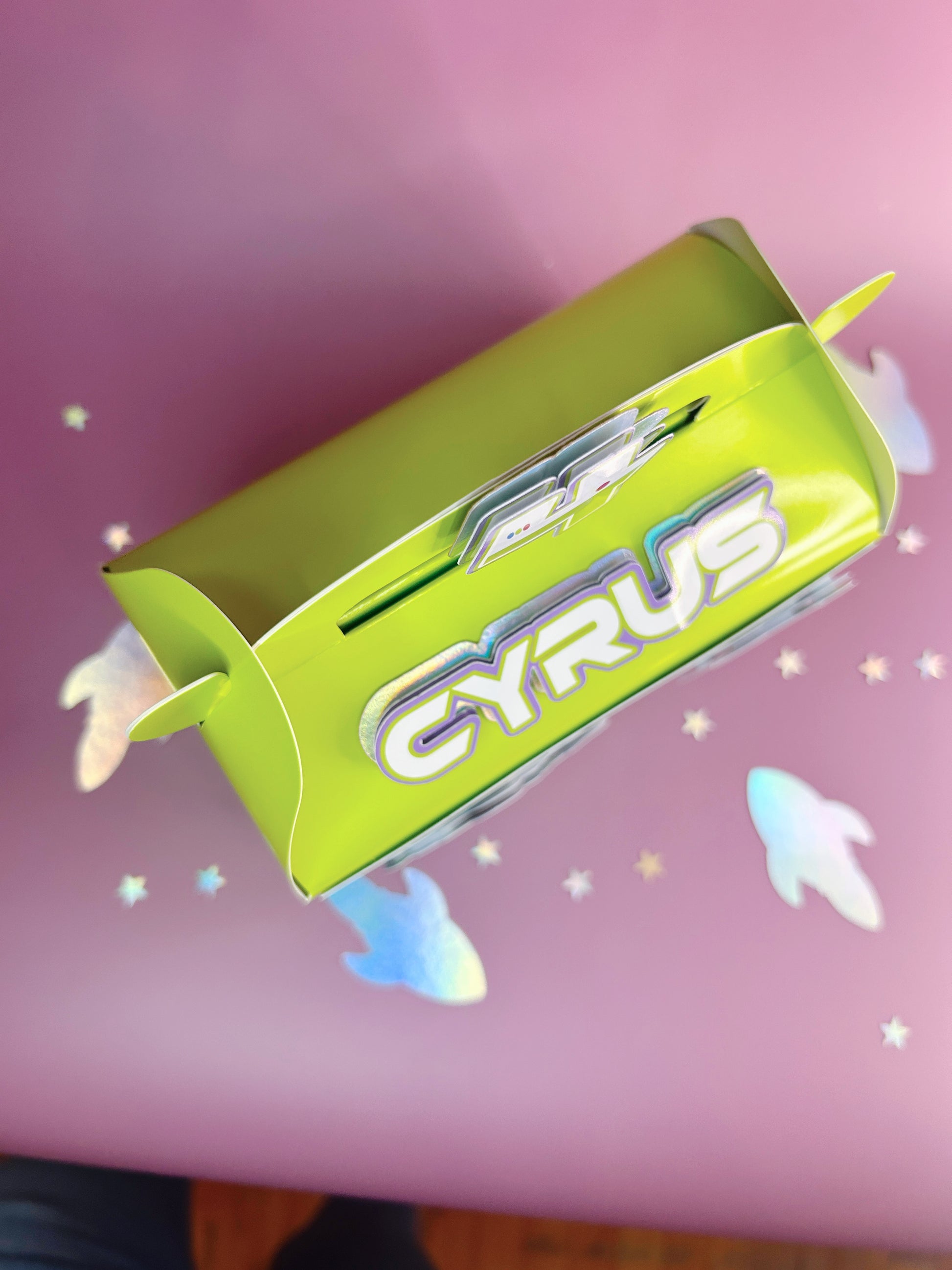 The Buzz Lightyear gable box features vibrant colors, including green, purple, and blue. The design incorporates a textured background along with holographic elements. Additionally, it showcases 3D cutouts of the main characters from this theme.